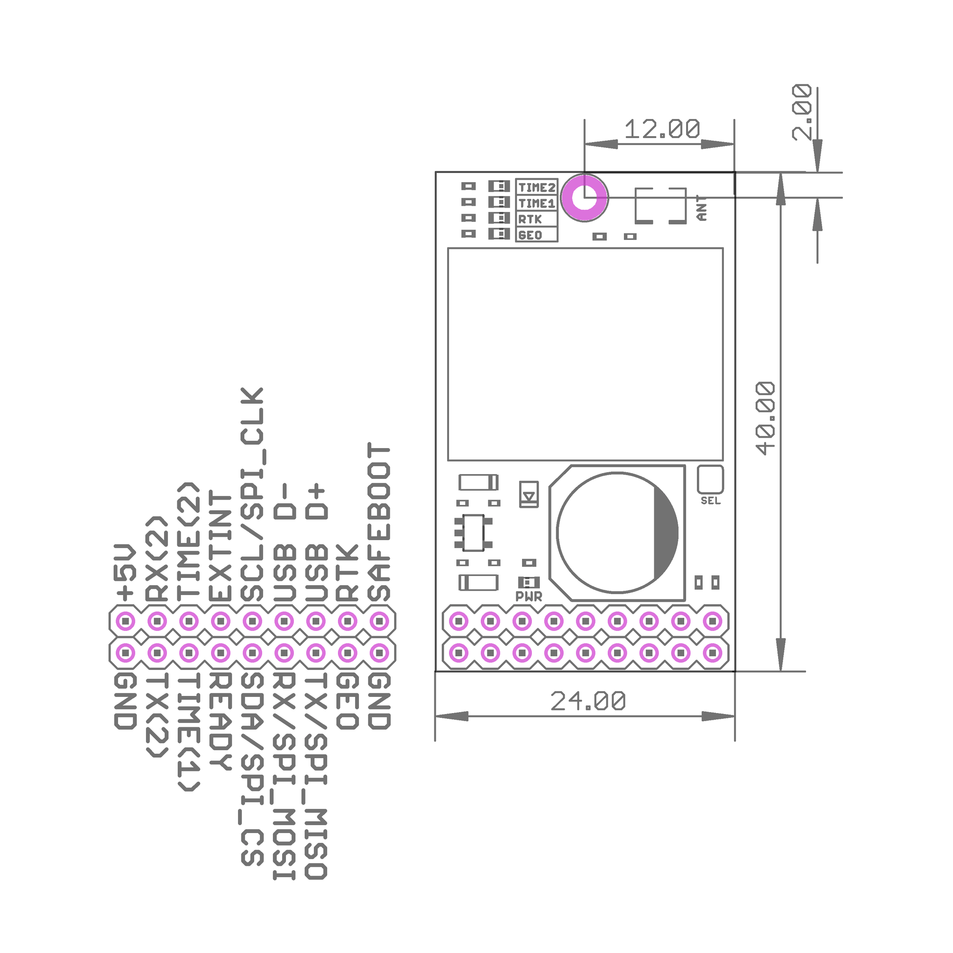 - Time pulses 1 and 2: Green LED, GEO: Orange LED, RTK: Red LED